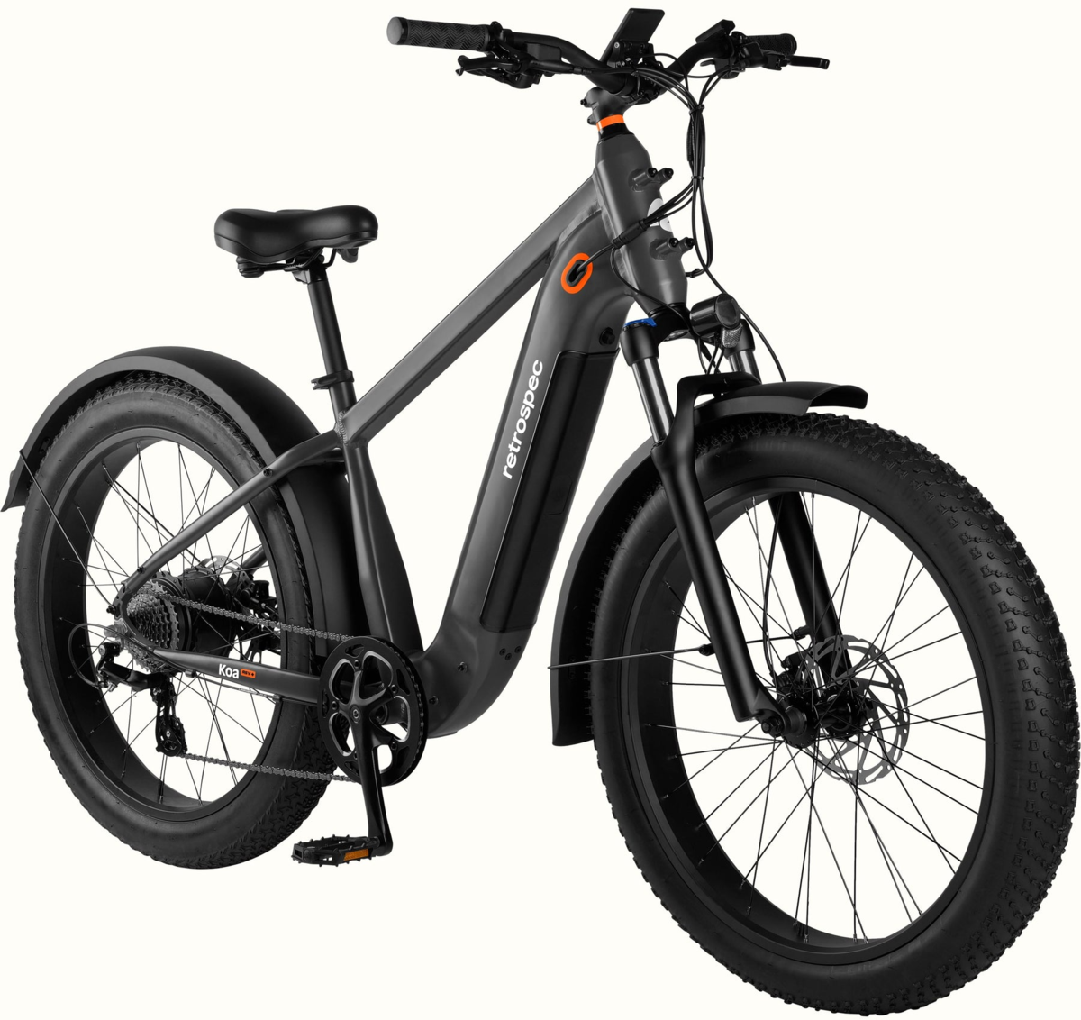 Get ready to explore uncharted territory with our sleekest, most modern fat tire electric bike. With the newest technologies seamlessly integrated to take you farther with more ease, this e-bike is the physical embodiment of “the latest and greatest.” But you don’t have to be an expert to love it – every last detail was intentionally designed to be user-friendly for riders of any skill level. Koa Rev+ thoughtfully pairs classic mountain bike features like wide tires and a suspension fork with powerful electric assets like pedal assist and throttle. Combine that with a frame geometry that allows for a more upright riding position, and you get a smooth, comfortable ride and the power to explore absolutely everywhere.